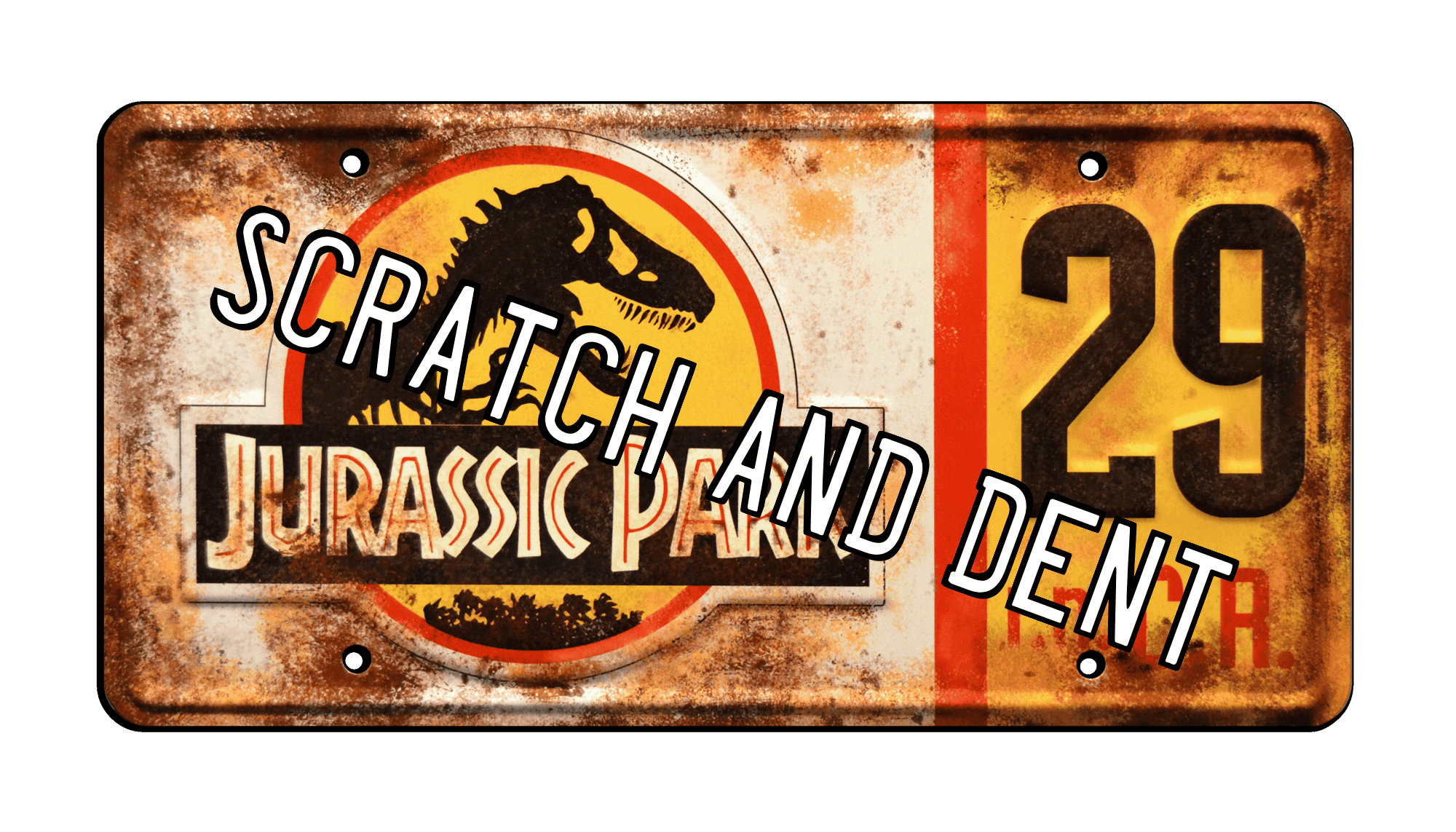 The rusted Jurassic Park #29 License Plate is produced in the very weathered condition in which it makes its reappearance in the 2015 movie Jurassic World, more than 20 years after Hammond’s Jeep had been abandoned at the original Visitor Center in Jurassic Park. The “rust” is screen printed onto the plate. Our plates are made from aluminum so they will not naturally rust. The plate is smooth to the touch, but certainly has the illusion of looking old and rusted from a distance!